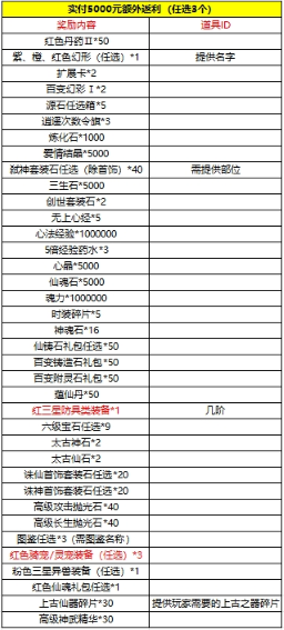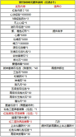 玩家单日充值100000元(实付1000元)以上可从额外奖励表中任选一种奖励进行额外申请